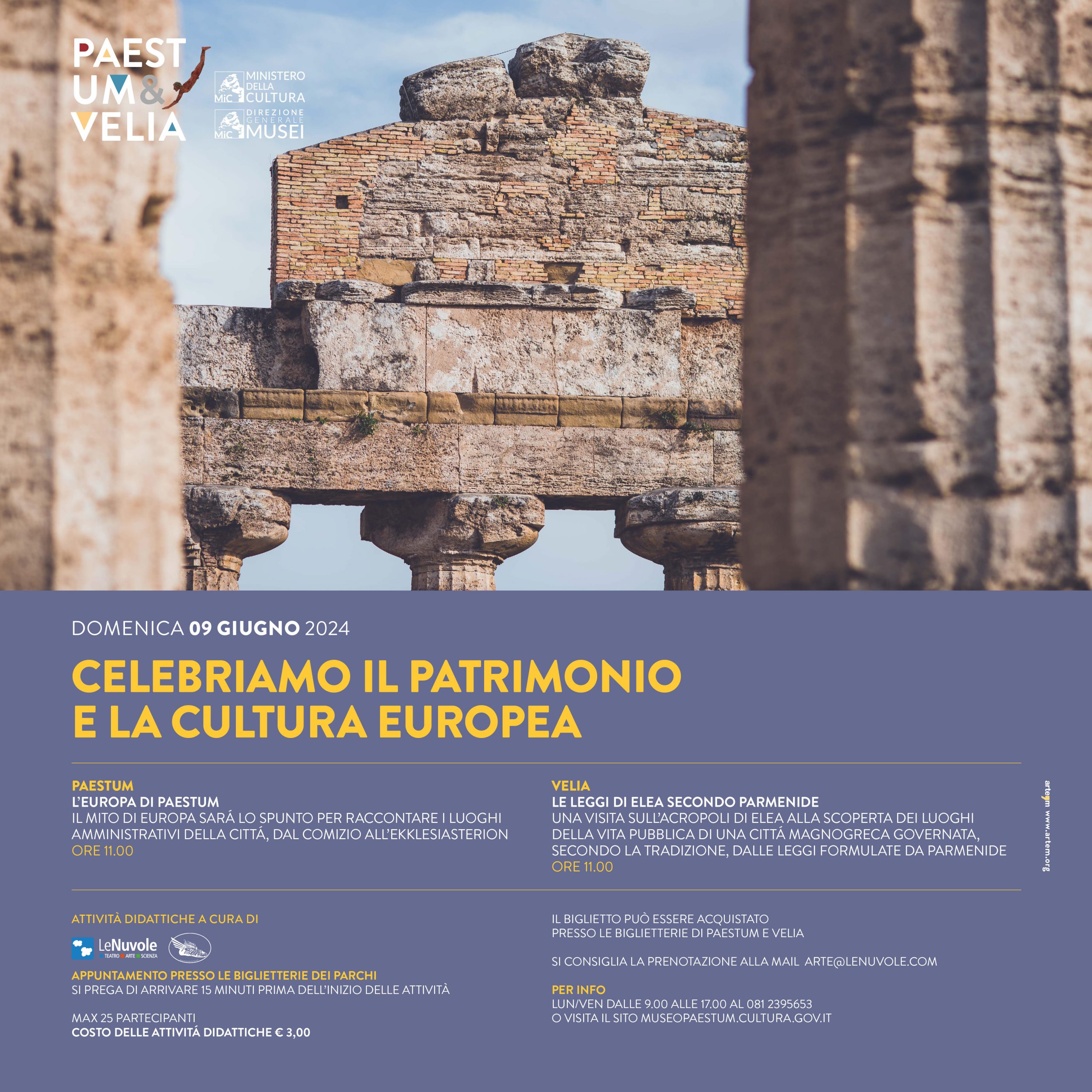 Domenica 9 giugno 2024, a Paestum e Velia celebriamo il patrimonio e la cultura europea. L’obiettivo delle iniziative, come indicato dal Ministero della Cultura, è quello di dare un segno visibile dell’importanza delle comuni radici e dei valori storici, artistici e culturali che si considerano come elementi fondanti e identitari dell’Europa.