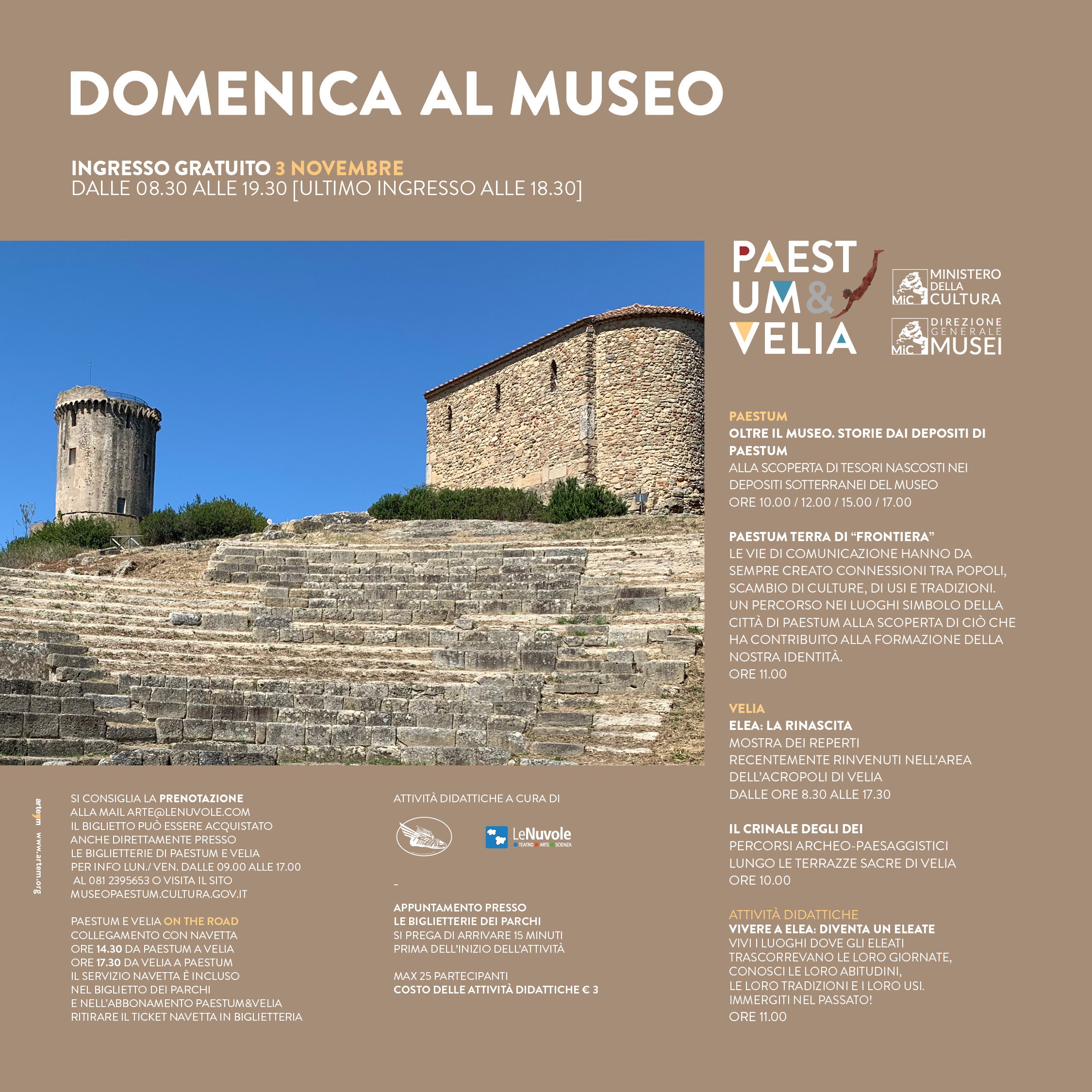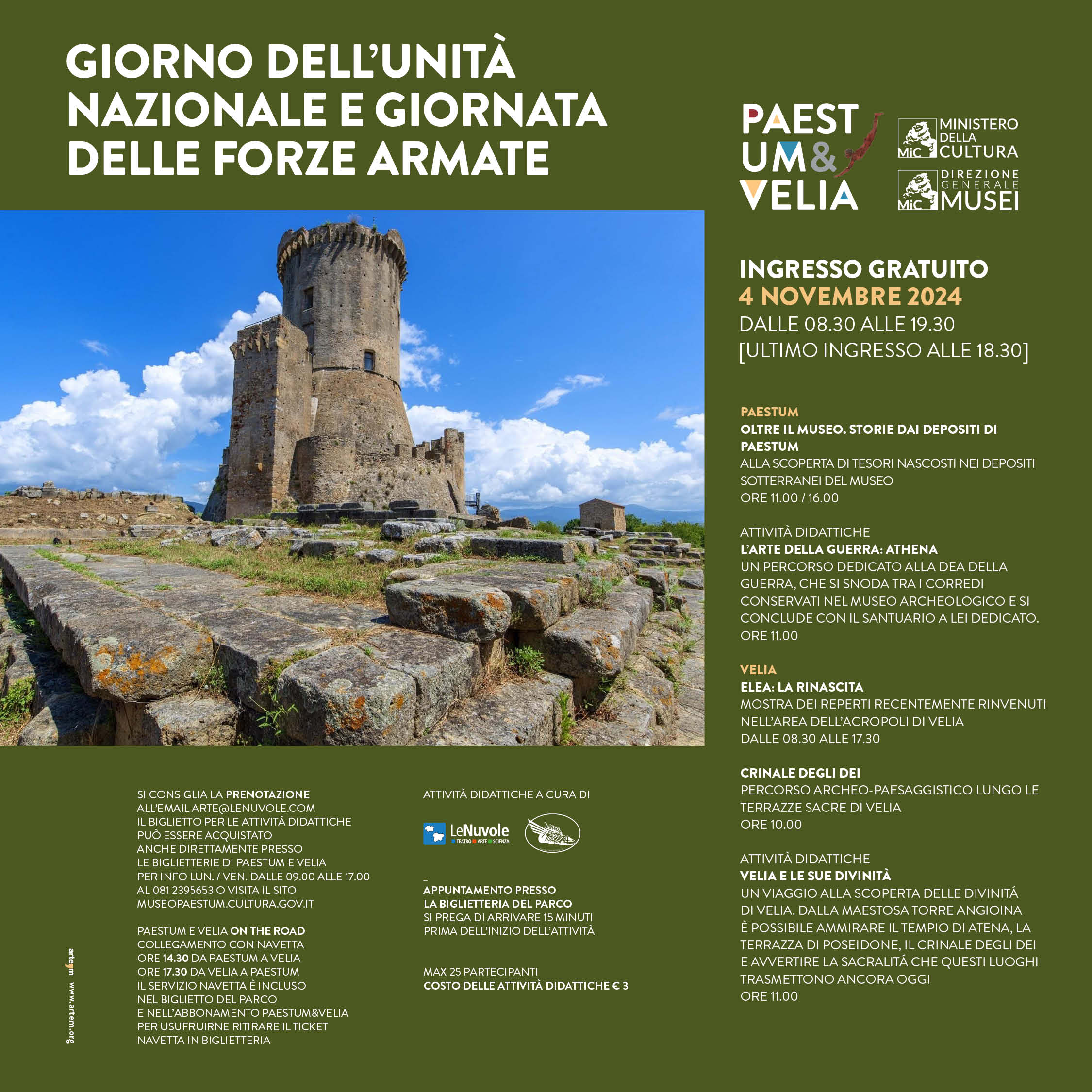 Per prenotazioni arte@lenuvole.com oppure dal lunedì al venerdì, dalle ore 9:00 alle ore 17:00, telefonare al 0812395653. Il biglietto per le attività può essere acquistato direttamente presso le biglietterie di Paestum e Velia.