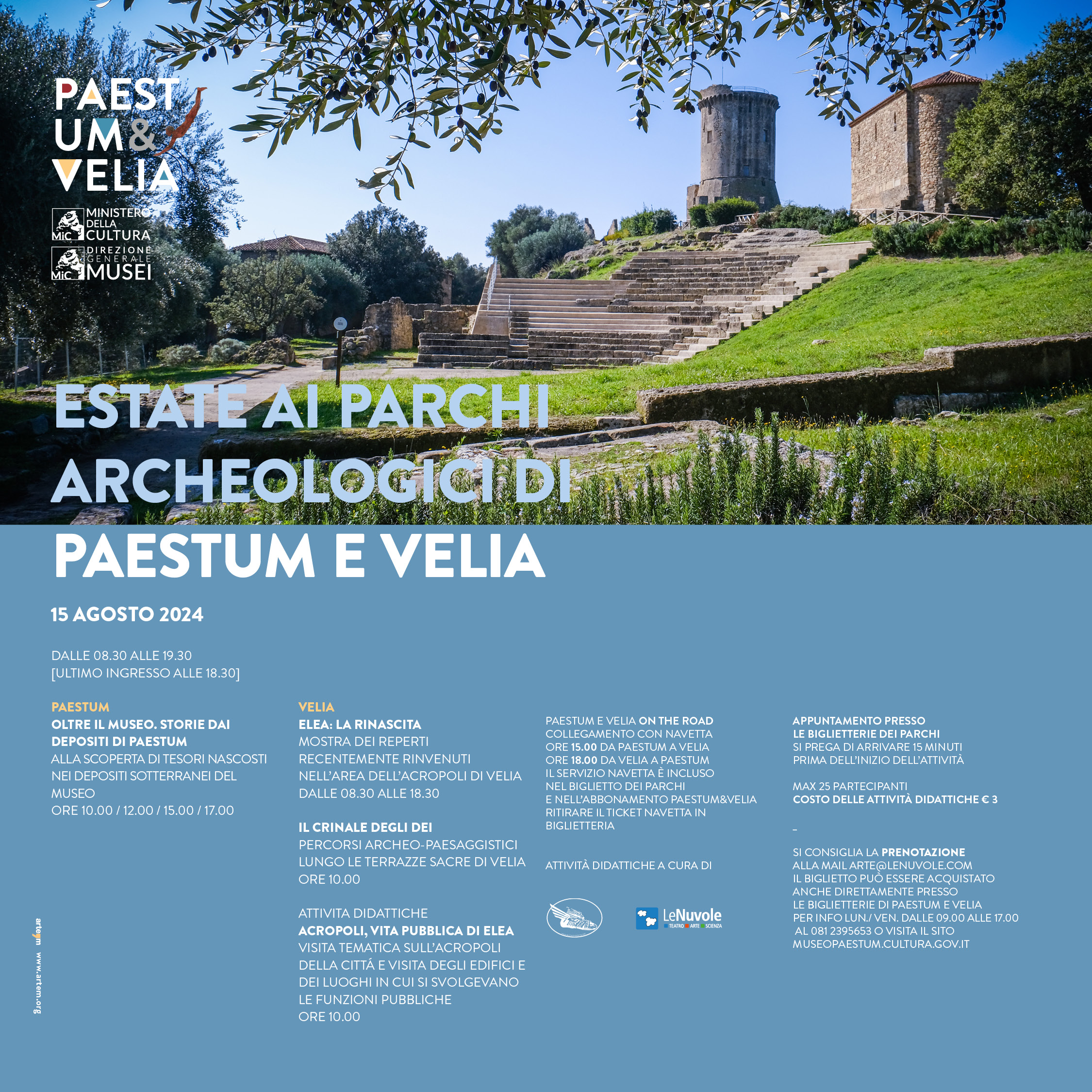 Per prenotazioni arte@lenuvole.com oppure dal lunedì al venerdì, dalle ore 9:00 alle ore 17:00, telefonare al 0812395653. Il biglietto per le attività può essere acquistato direttamente presso le biglietterie di Paestum e Velia.